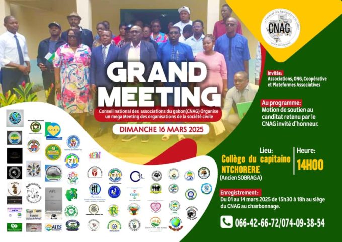 ByEyeng Obame14 mars 2025Le Conseil National des Associations du Gabon organise un grand meeting ce dimanche 16 mars 2025 à partir de 14h00, au Collège Ntchoréré...